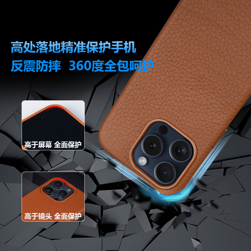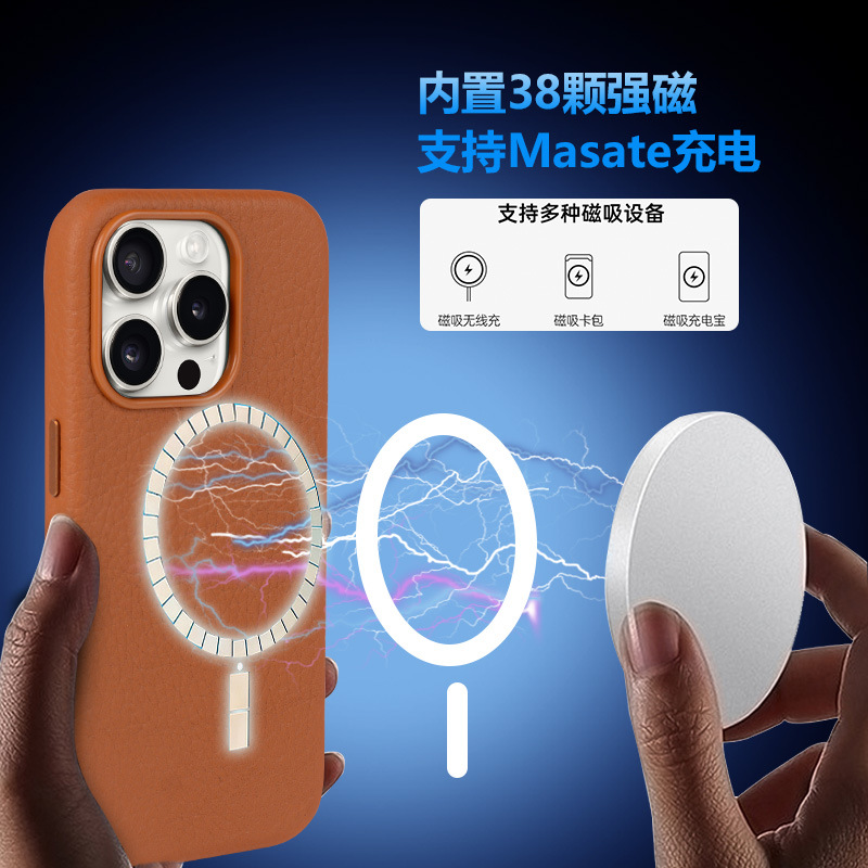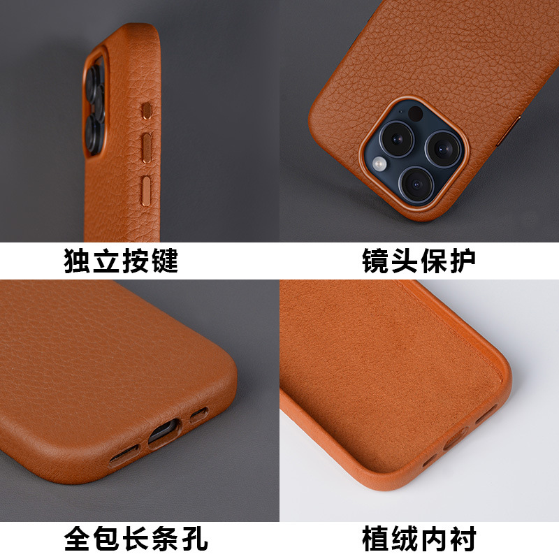 适用苹果15promax磁吸真皮荔枝纹手机壳15原装官网皮革手机外壳